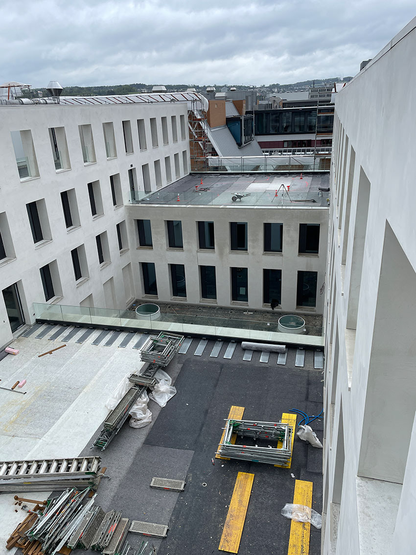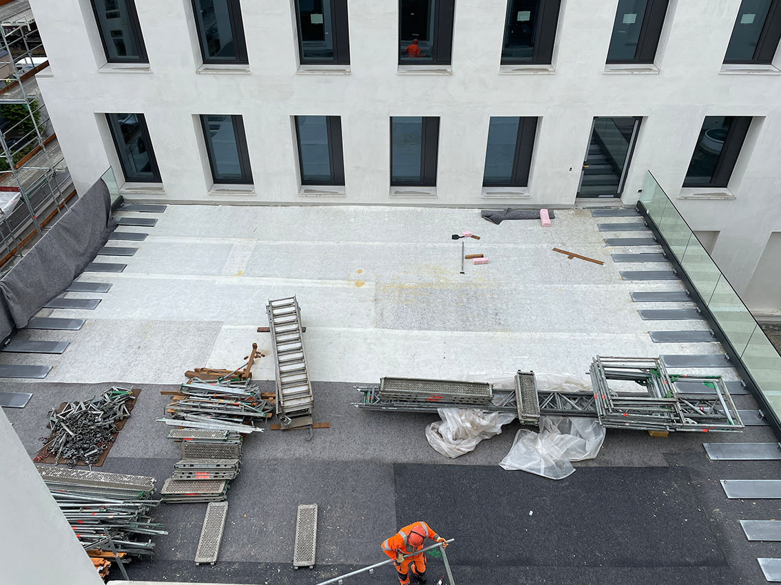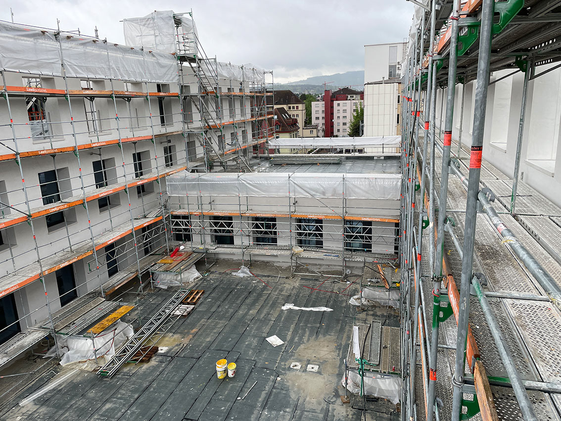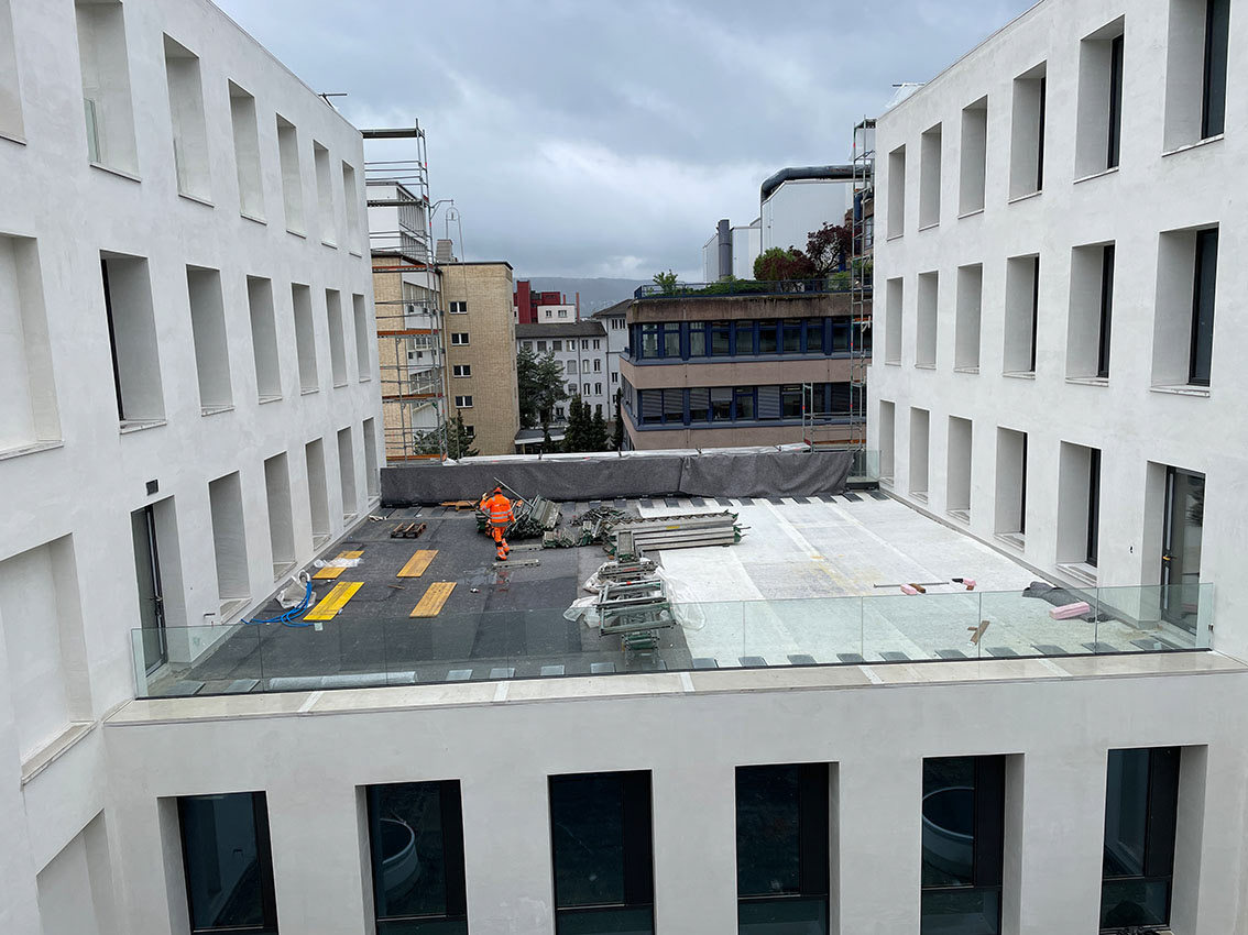 Während an den Aussenfassaden noch fleissig gearbeitet wird kann der Ausbau der Dachterrassen bereits starten.