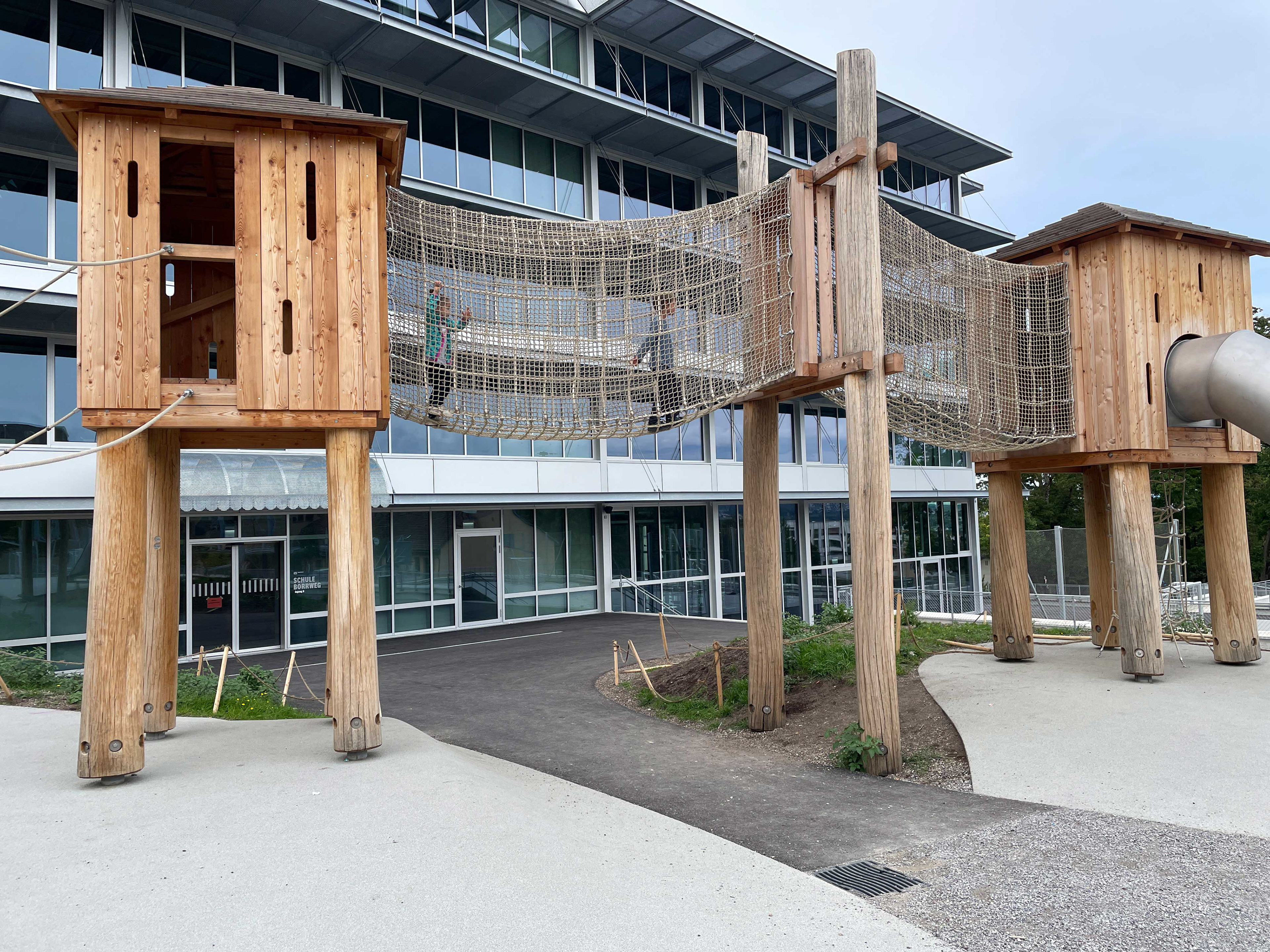 Ebene 2 ist Hauptzugangsebene zum Schulhaus. Über einen mit lockeren Gruppen aus Kleinbäumen bestandenen Vorplatz gelangt man in die Schule und die auf dieser Ebene befindliche Mensa. Zwischen den Schulhäusern Borrweg und Friesenberg sind auf der strassenabgewandten Seite ein Allwetterplatz mit umfangreicher Sportausstattung sowie der Pausenplatz angeordnet. Auf dem chaussierten Platz angeordnete Spielgeräte, Tischtennisplatten und mobile Spielelemente sind Angebote für alle Altersgruppen.