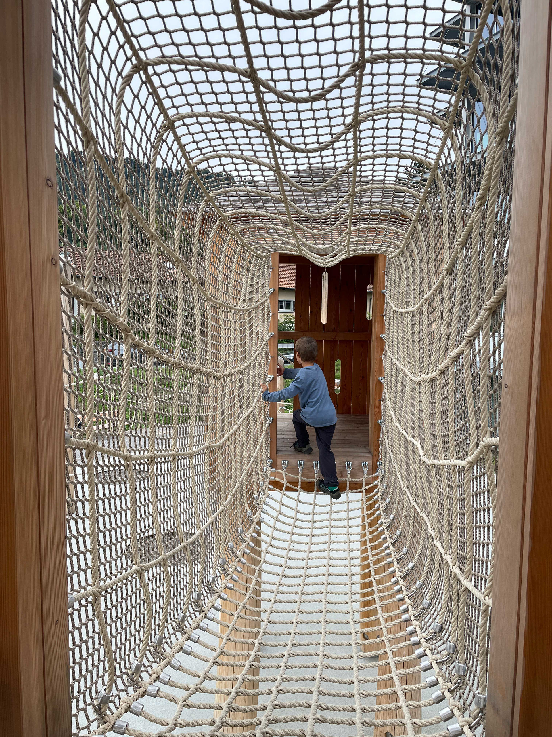 Die Spielmöglichkeiten sind als Waldspielplatz mit vielfältigen Kletterelementen und Baumhäusern geplant.