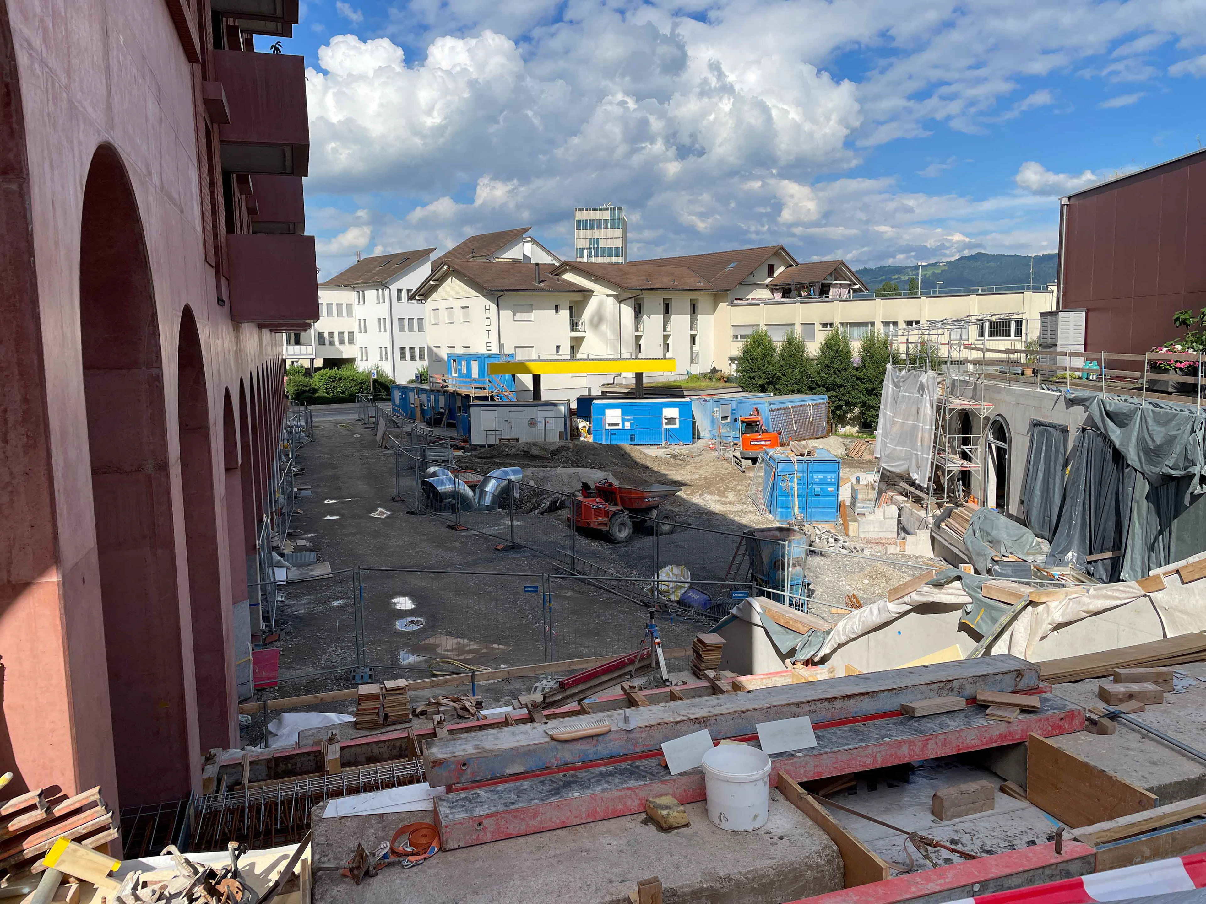 Die letzten Werkleitungsarbeiten sind noch nicht abgeschlossen und die Rohbauarbeiten im angrenzenden Umbauprojekt in vollem Gange.