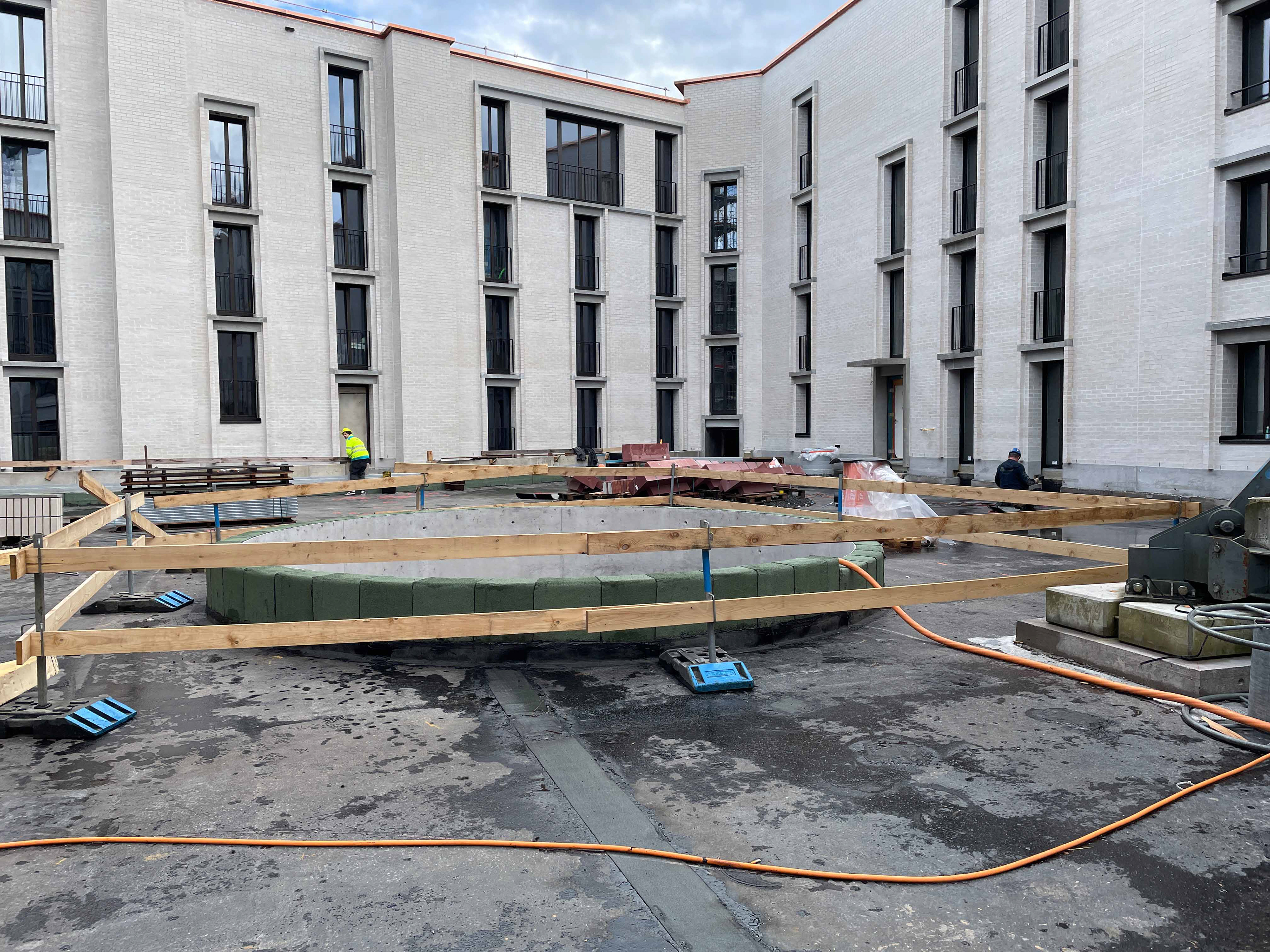 Baustart im Hof A Noch stehen die letzten Gerüste und der Hochbaukran.